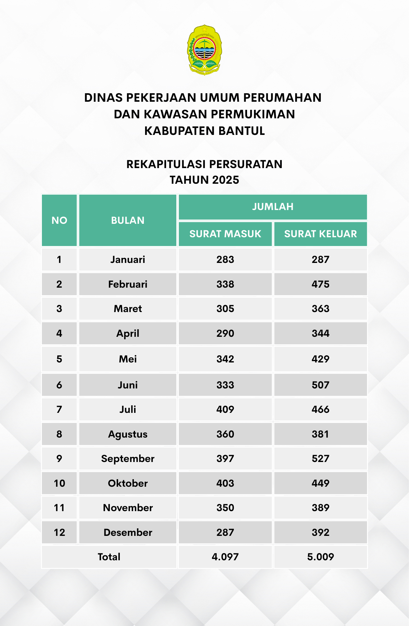 Rekapitulasi persuratan yang terdiri dari surat masuk dan surat keluar yang ada di Dinas Pekerjaan Umum Perumahan dan Kawasan Permukiman Kabupaten Bantul setiap bulannya :