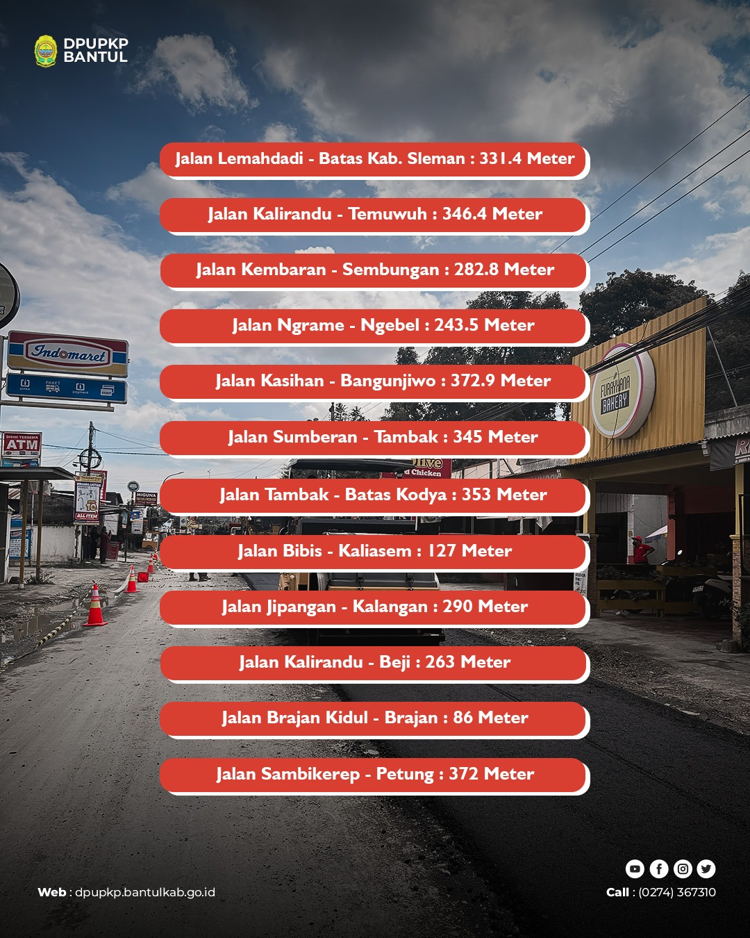 Pemerintah Kabupaten Bantul melalui Dinas Pekerjaan Umum, Perumahan dan Kawasan Permukiman (DPUPKP) Kabupaten Bantul telah menyelesaikan pekerjaan pengaspalan pada 12 ruas jalan di wilayah Kapanewon Kasihan. Selesainya kegiatan ini menjadi upaya nyata pemerintah daerah dalam meningkatkan kualitas Infrastruktur jalan guna menunjang mobilitas masyarakat.